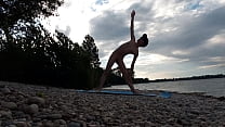 Slender nudist boy does yoga nude on a naturist...