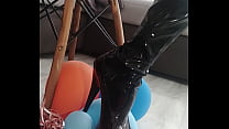 Veve performs balloon popping in latex stocking...