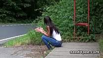 Skinny teen pissing behind a wall outdoor (5 min)