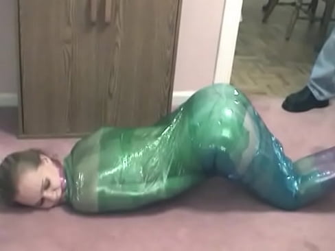 Fetish chick loves being wrapped in green plastic with her shaved pussy 7 min